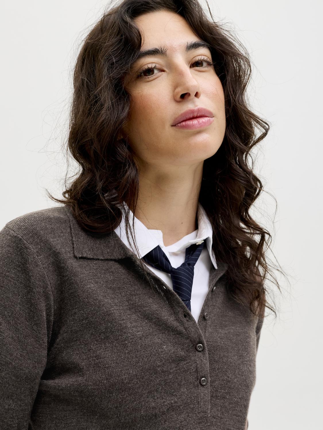 Denne uldblanding trøje med polo-krave har en tætsiddende pasform og lange ærmer. Den er strikket i en fladstrikket kvalitet, der kombinerer komfort og fleksibilitet. Trøjen lukkes med en kvart-knap lukning og har en mørk brun nuance.