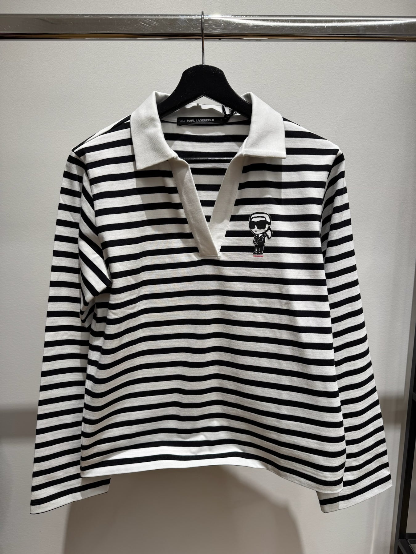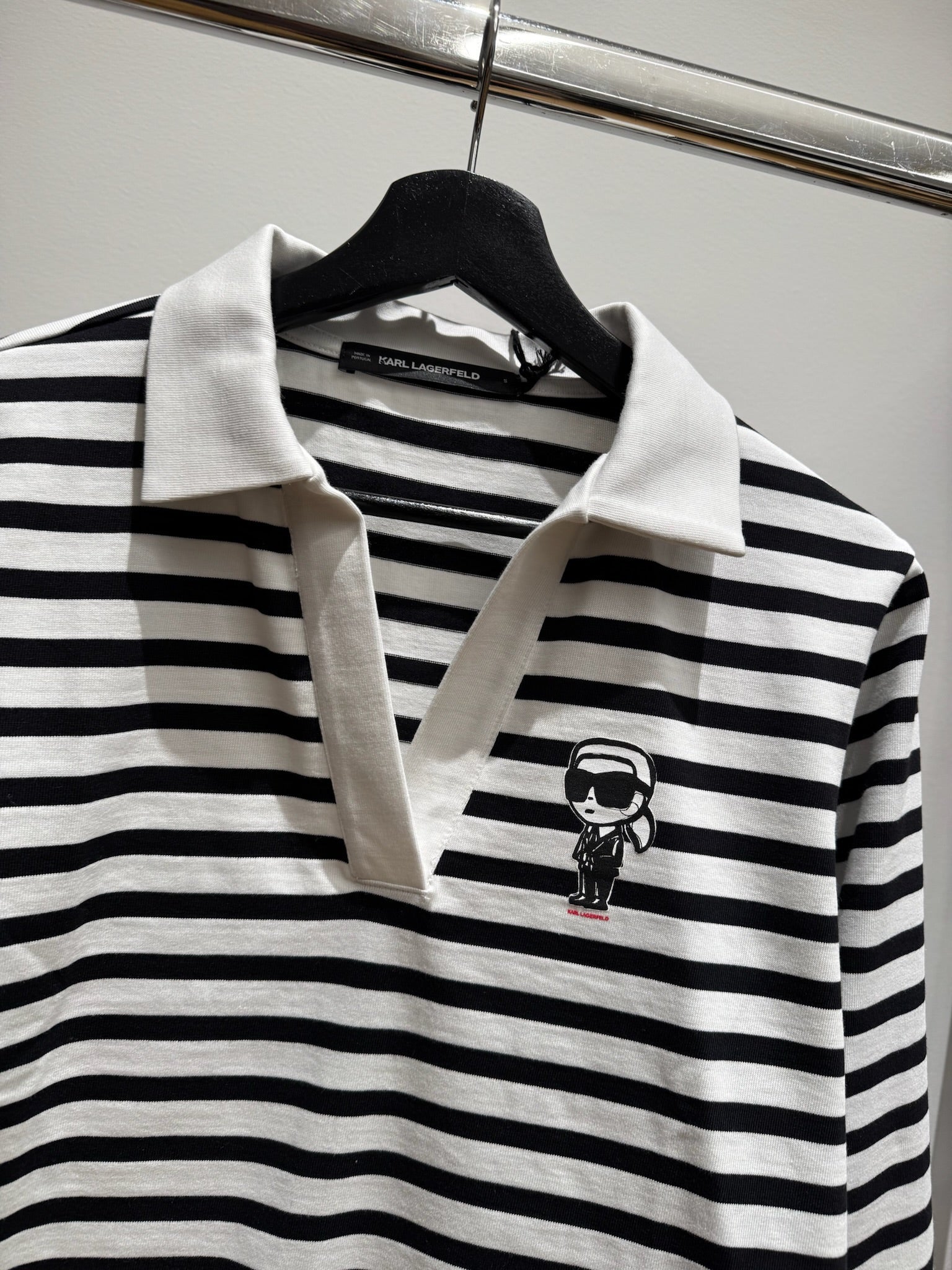 Black and white striped polo shirt from Karl Lagerfeld with iconic patch on the chest. The white collar has Karl Lagerfeld text on the back, making it ideal for café visits and casual conversations.