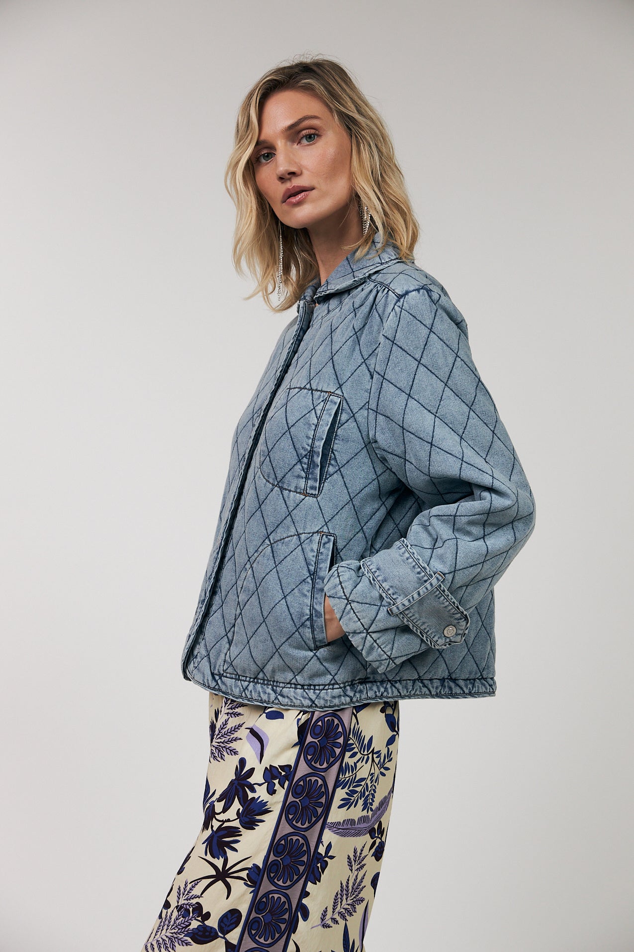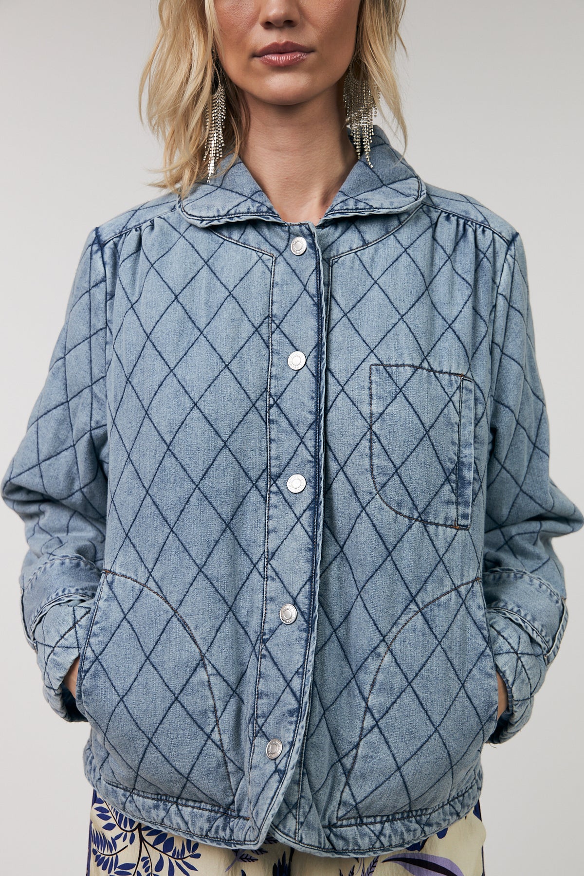 Viola er en quiltet denimjakke med et karakteristisk, grafisk mønster, der giver et cool twist til en klassisk silhuet. Jakken er lavet i blød denim med gennemgående quiltning i fine, buede linjer og synlige kontraststikninger, som fremhæver det dekorative udtryk.