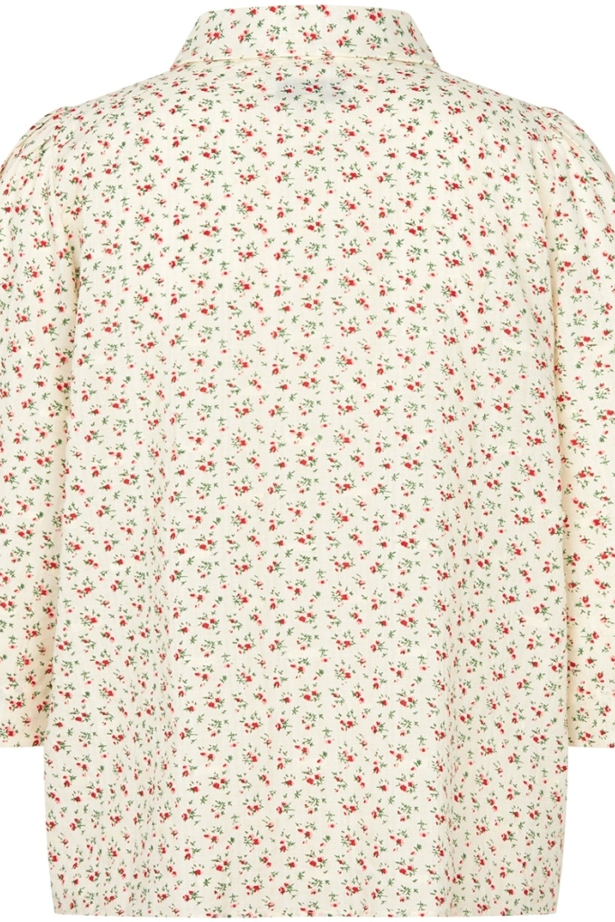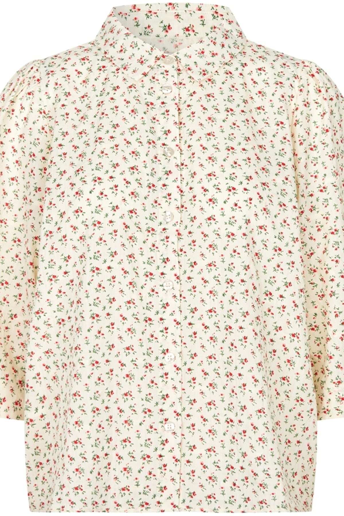 The Bono shirt from Lollys Laundry is a feminine shirt. The delicate floral print in small red and green shades on an off-white background gives the shirt a soft and feminine look that is perfect for both everyday wear and more dressed-up occasions.