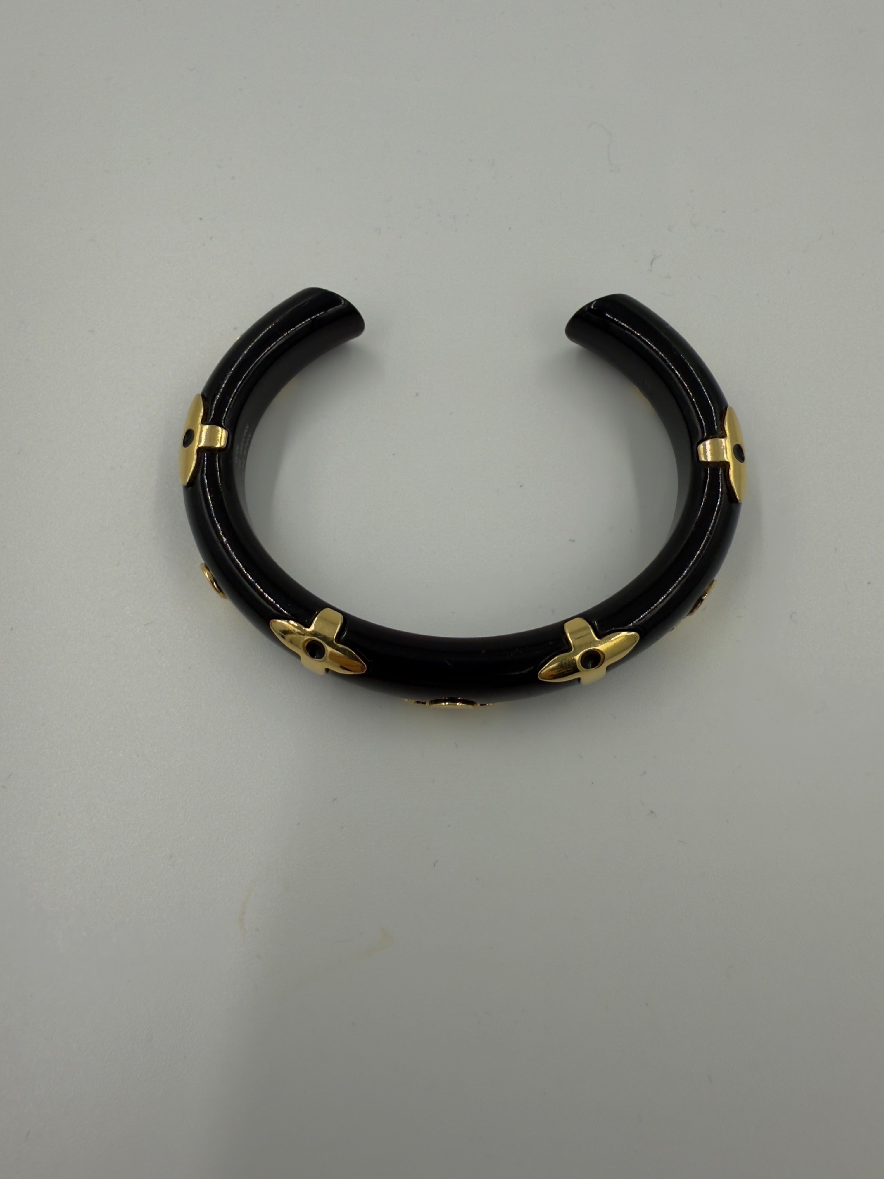 An exclusive Louis Vuitton bracelet in a half-open cuff model, made of black leather with a glossy finish. The bracelet is decorated with several gold-colored metal fittings shaped like the iconic Louis Vuitton Monogram flowers. The fittings are evenly distributed around the entire hoop and give the jewelry an elegant, luxurious and recognizable LV expression.