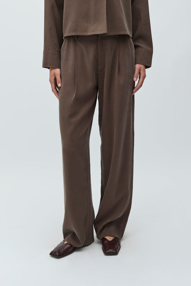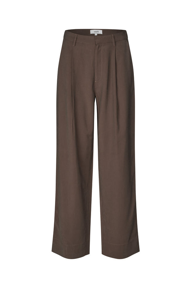 Daniello bukserne fra MbyM er elegante, wide leg bukser i en varm brun nuance med et let glansfuldt udtryk. Disse bukser har høj talje, læg fortil samt lynlås- og hægtelukning, som giver et klassisk og sofistikeret look.