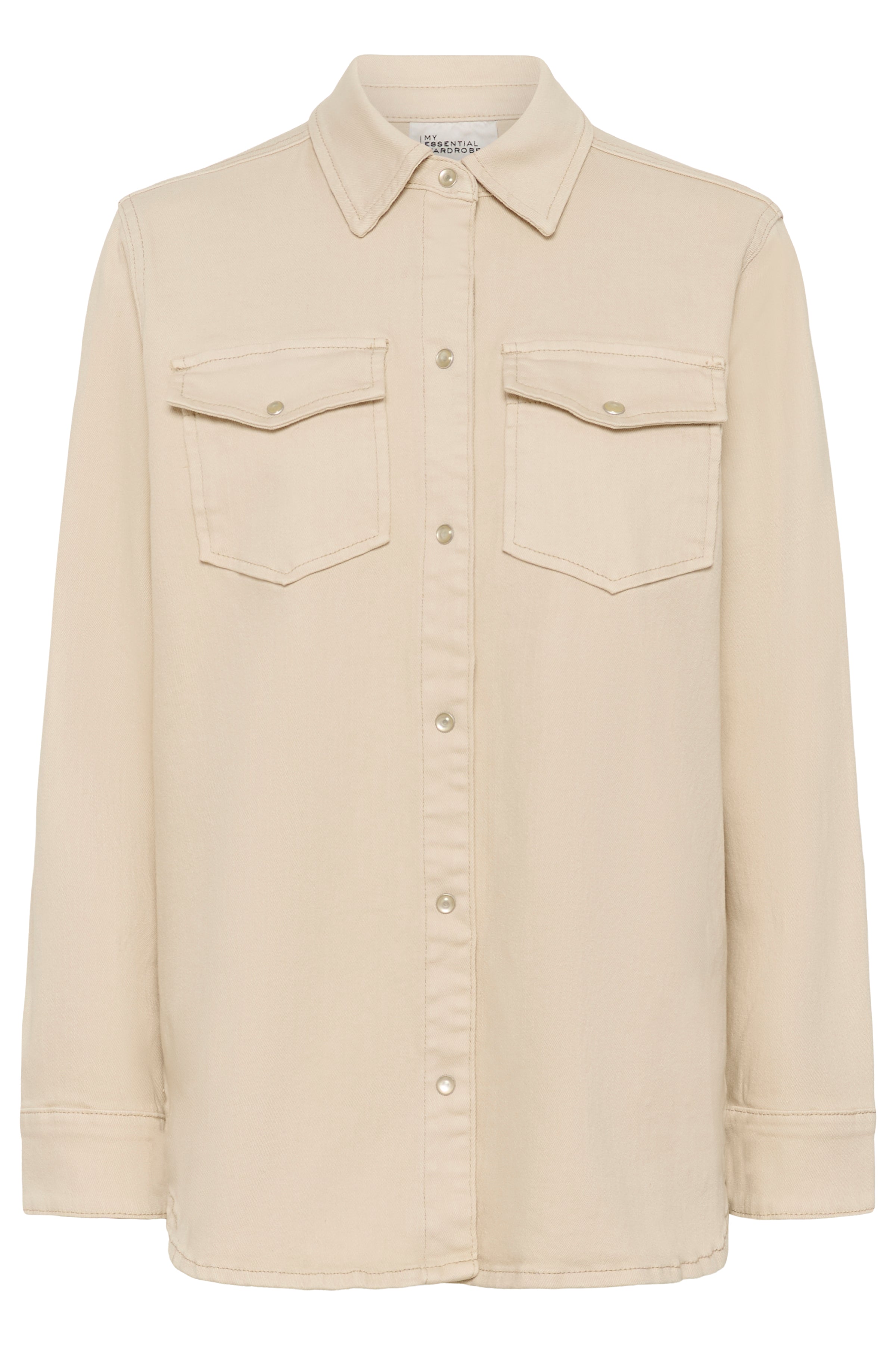 Den lyse beige nuance gør skjorten nem at style både lukket som skjorte eller åben som en let overshirt. Se flere styles fra My Essential Wardrobe.