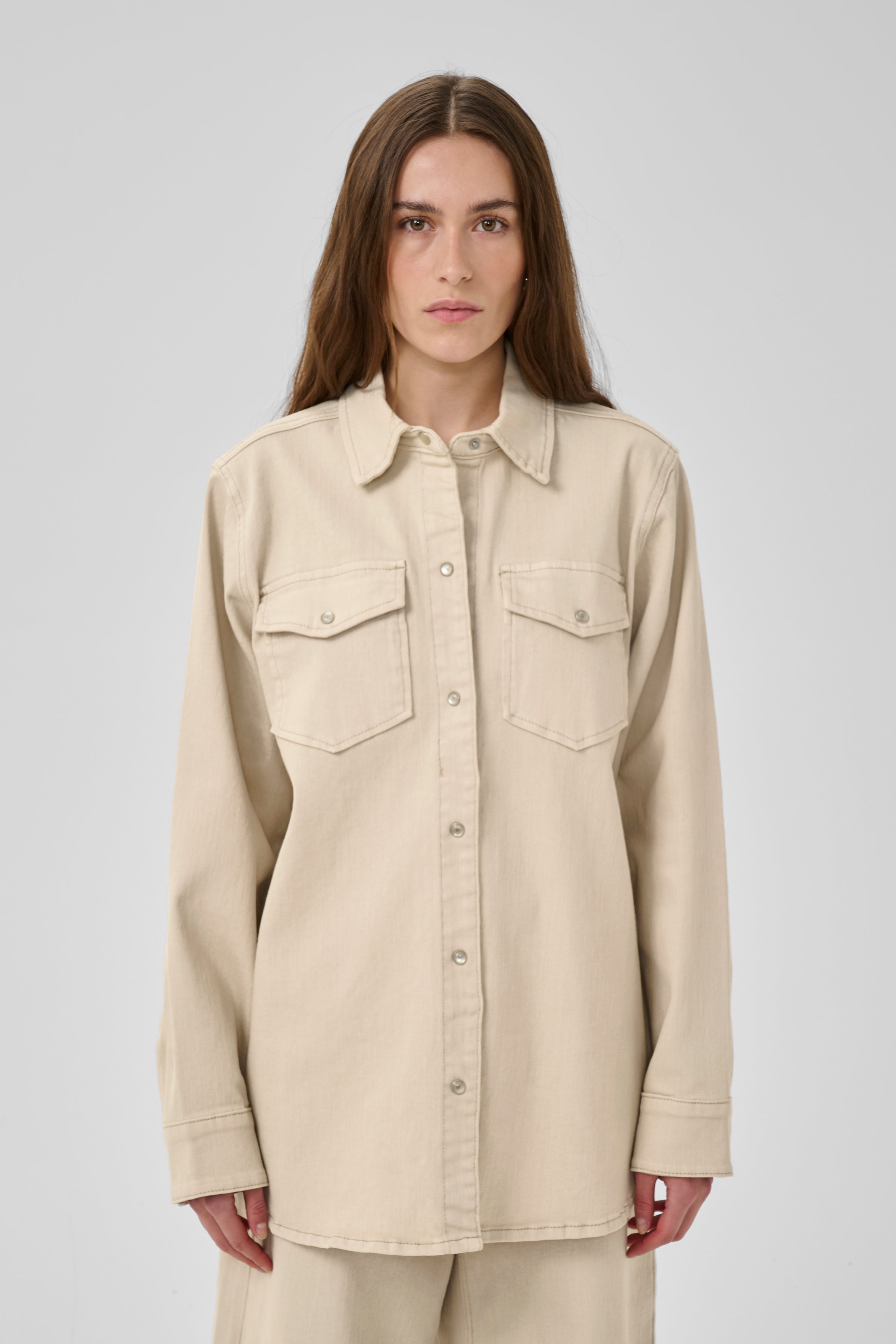 Dagmar er en klassisk denimskjorte i en blød, sandfarvet vask med en afslappet, let oversize pasform. Designet er inspireret af workwear med traditionel krave, gennemgående trykknaplukning og to brystlommer med klap og trykknap. De lange ærmer har manchetter med trykknapper, og den let afrundede kant giver et flot fald.