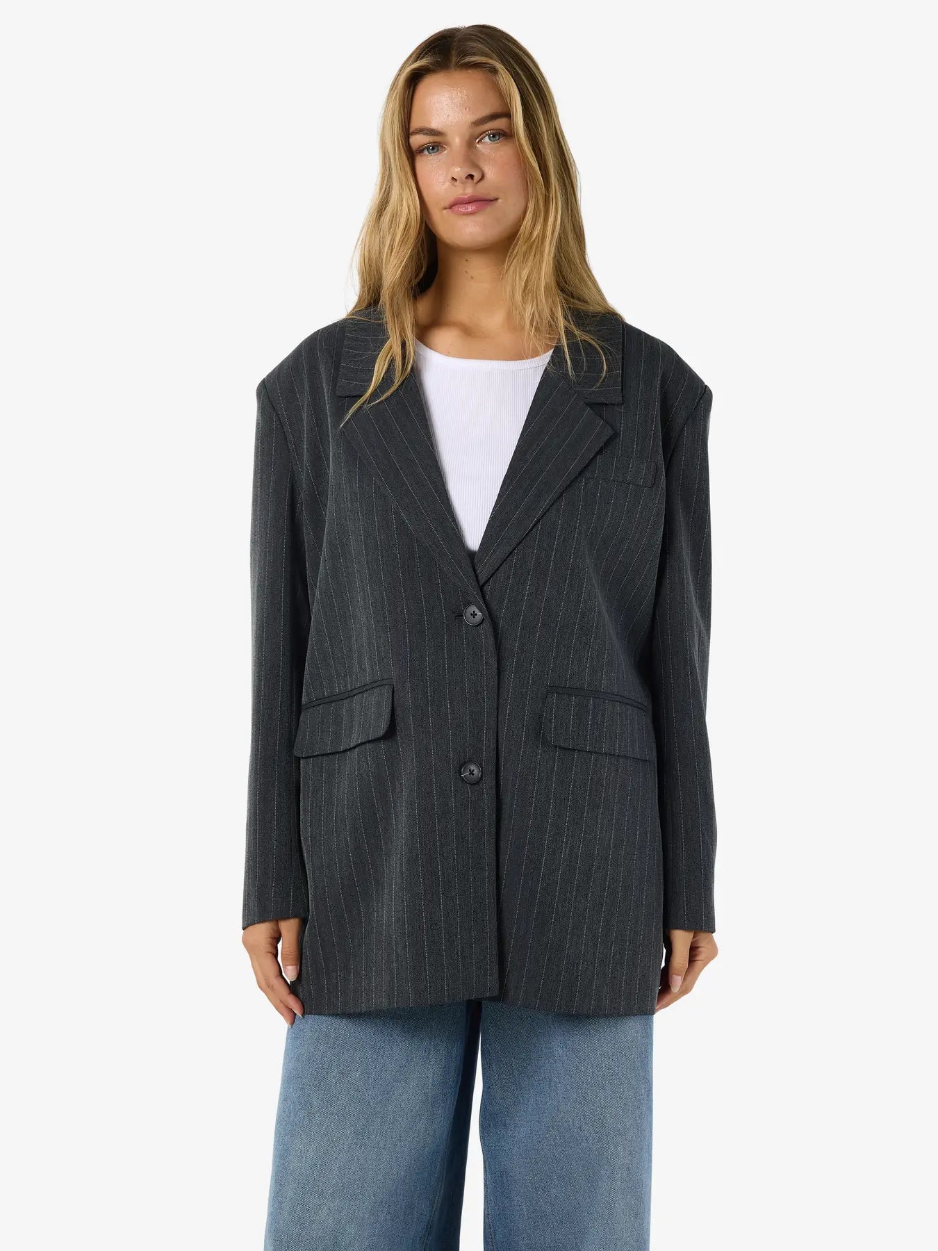 Celia Blazer fra Noisy May er en moderne mørkegrå blazer med et afslappet oversize fit. Den har klassisk reverskrave, knaplukning og praktiske forlommer, som giver et tidløst og stilrent look – perfekt til både hverdag og pænere brug.