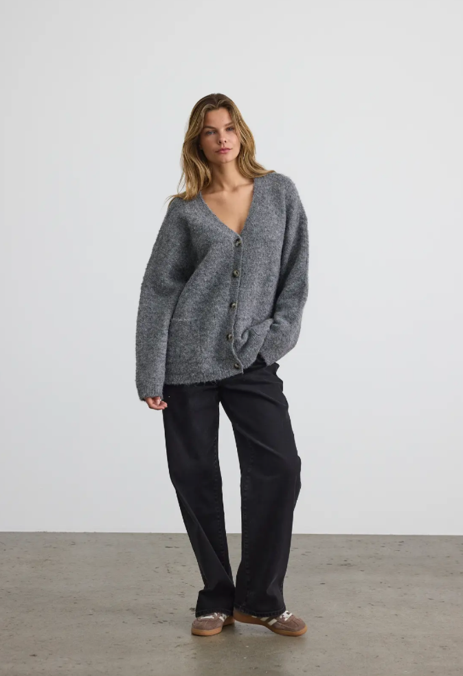 Lang og blød cardigan fra Noisy May. Strikken har en dyb v-udskæring, knapper foran og to lommer. Derudover er den i en løs pasform.