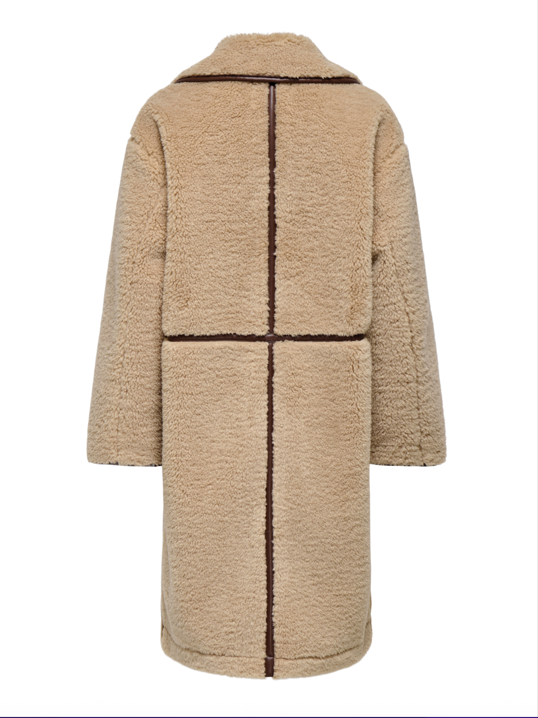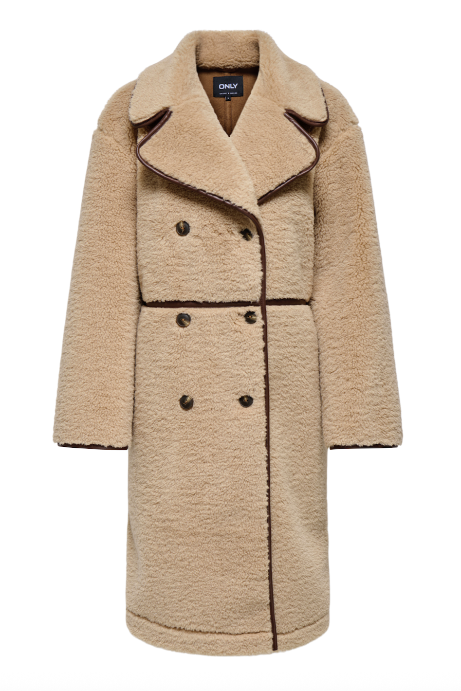 Lang og vamsede jakke fra Only. Jakken er i en beige plys farve og har mørke brune detaljer på sig, derudover lukkes den med knapper hele vejen ned og har lommer i siden.