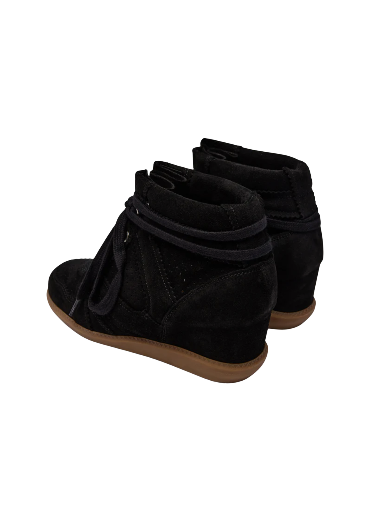 Black ankle boot made of suede with an internal platform heel. It is decorated with stitching and cool details around the boot. Lace the boots with the long laces, which can be tied in different ways.