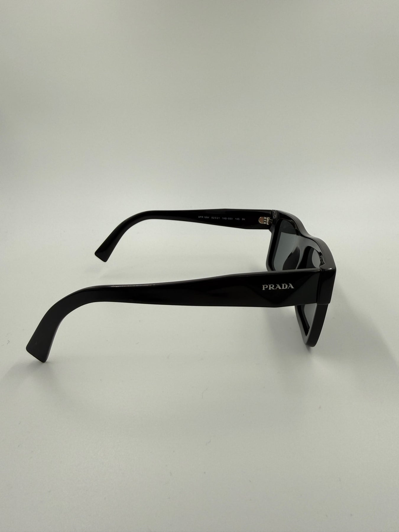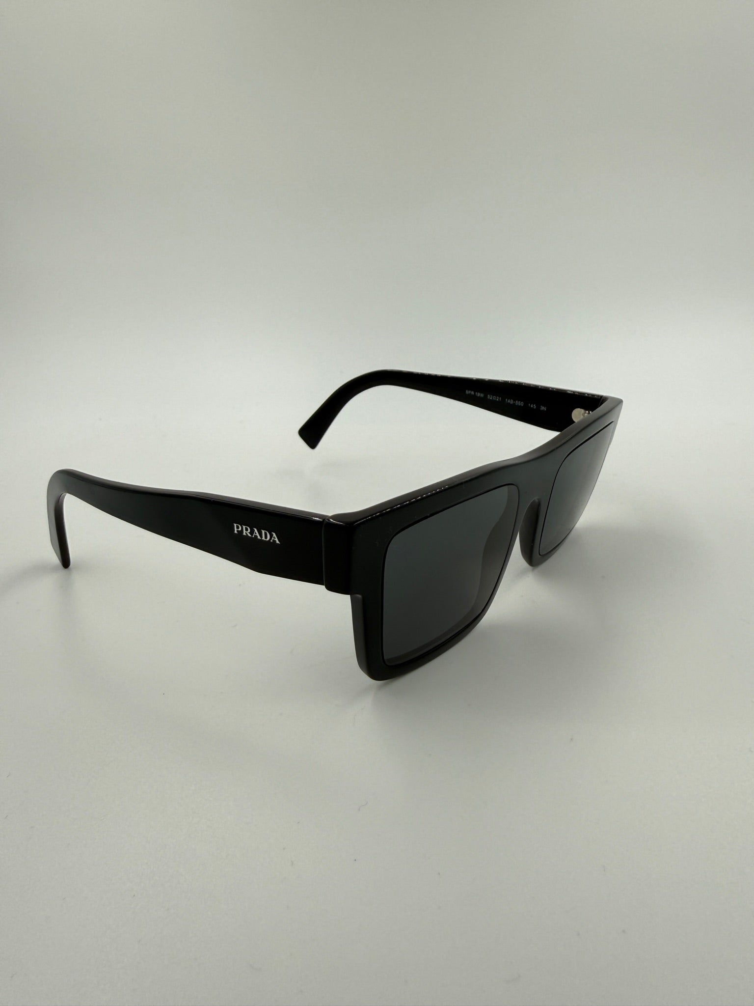Stilrene og markante solbriller fra Prada i klassisk sort design. Modellen PR 19WS har et moderne, kantet udtryk med brede stænger og diskret Prada-logo på siden, som understreger det eksklusive og tidløse look. De mørke glas kombineret med den firkantede front gør modellen velegnet til både hverdag og mere formelle anledninger.