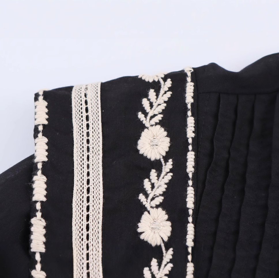 Fin skjorte bluse fra Sassy Copenhagen. Blusen har en rund halsudskæring og har creme hvide blonde detaljer på sig.