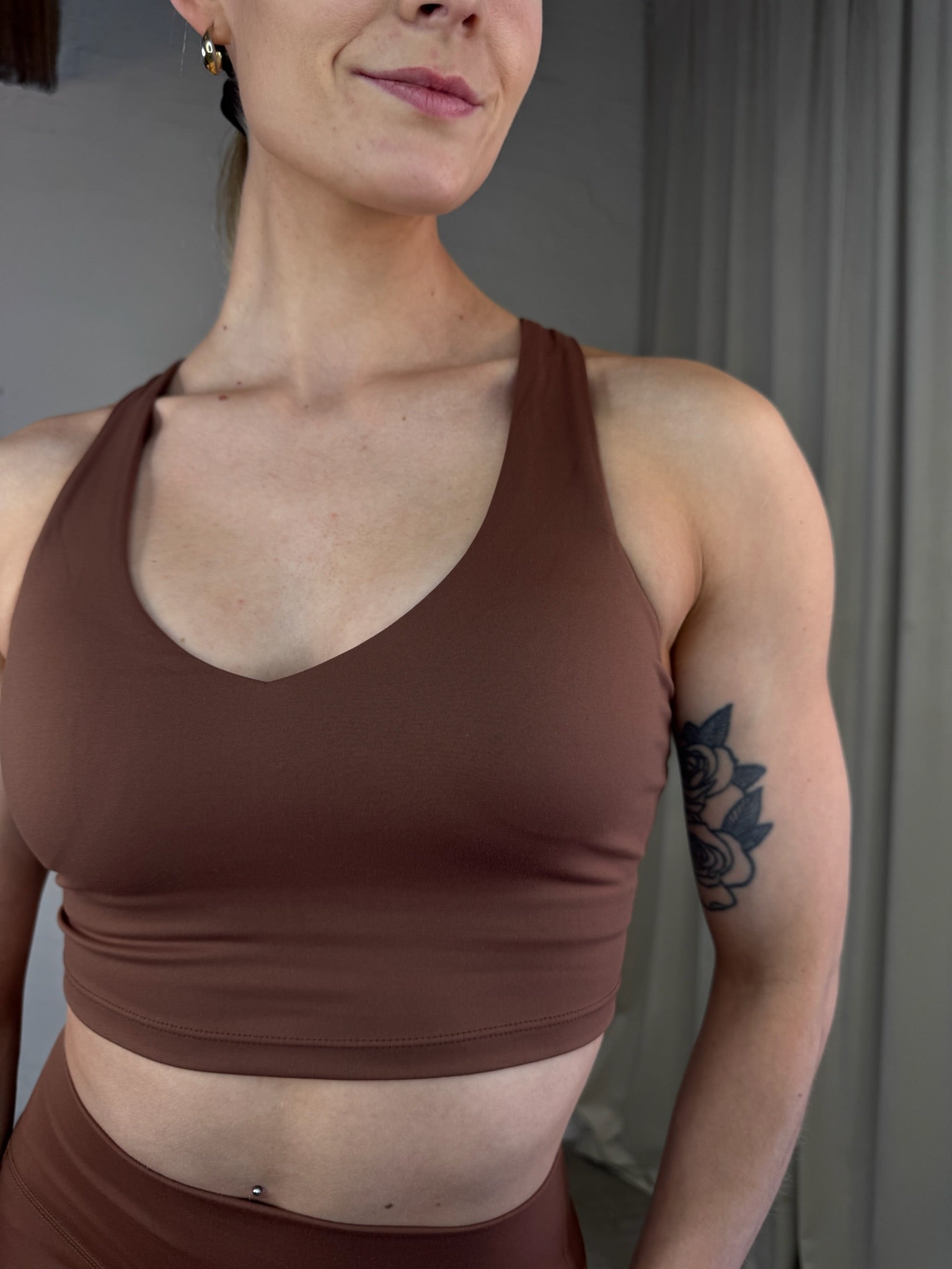 Thyra sportstop i rustbrun farve er designet med en indvendig ekstra top og elastik i bunden for øget støtte og komfort. De udtagelige indlæg giver mulighed for individuel pasform og fleksibel støtte under træning.