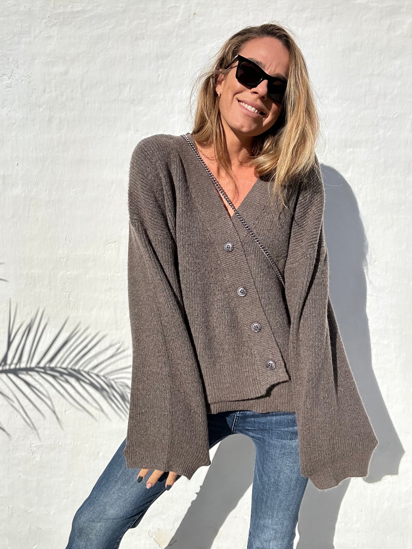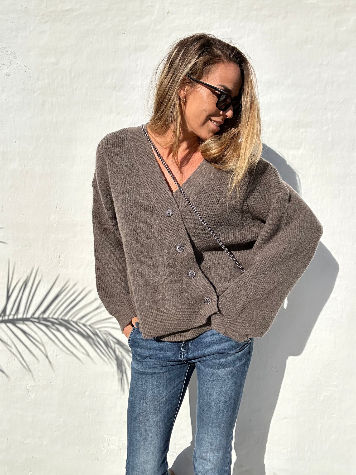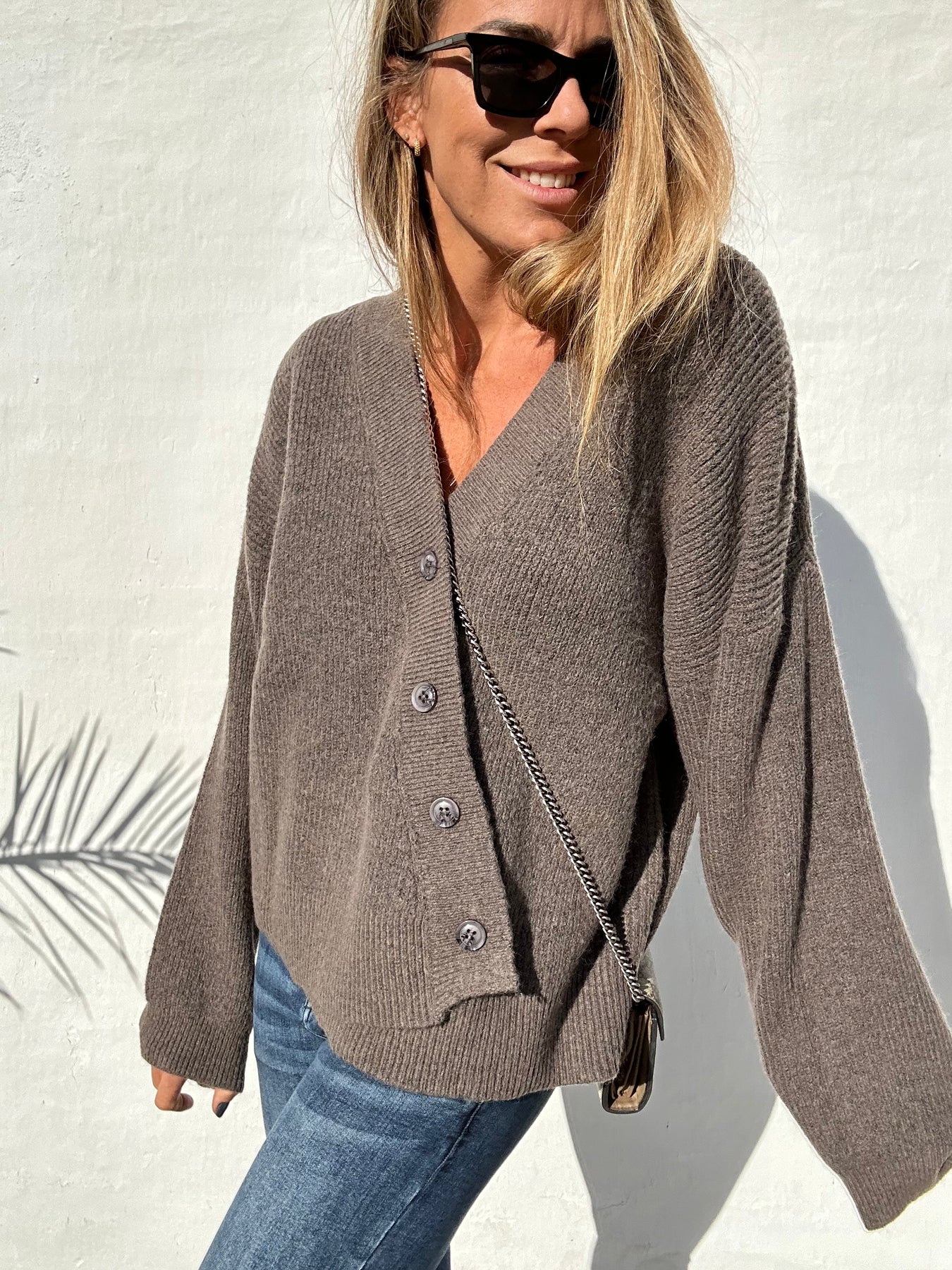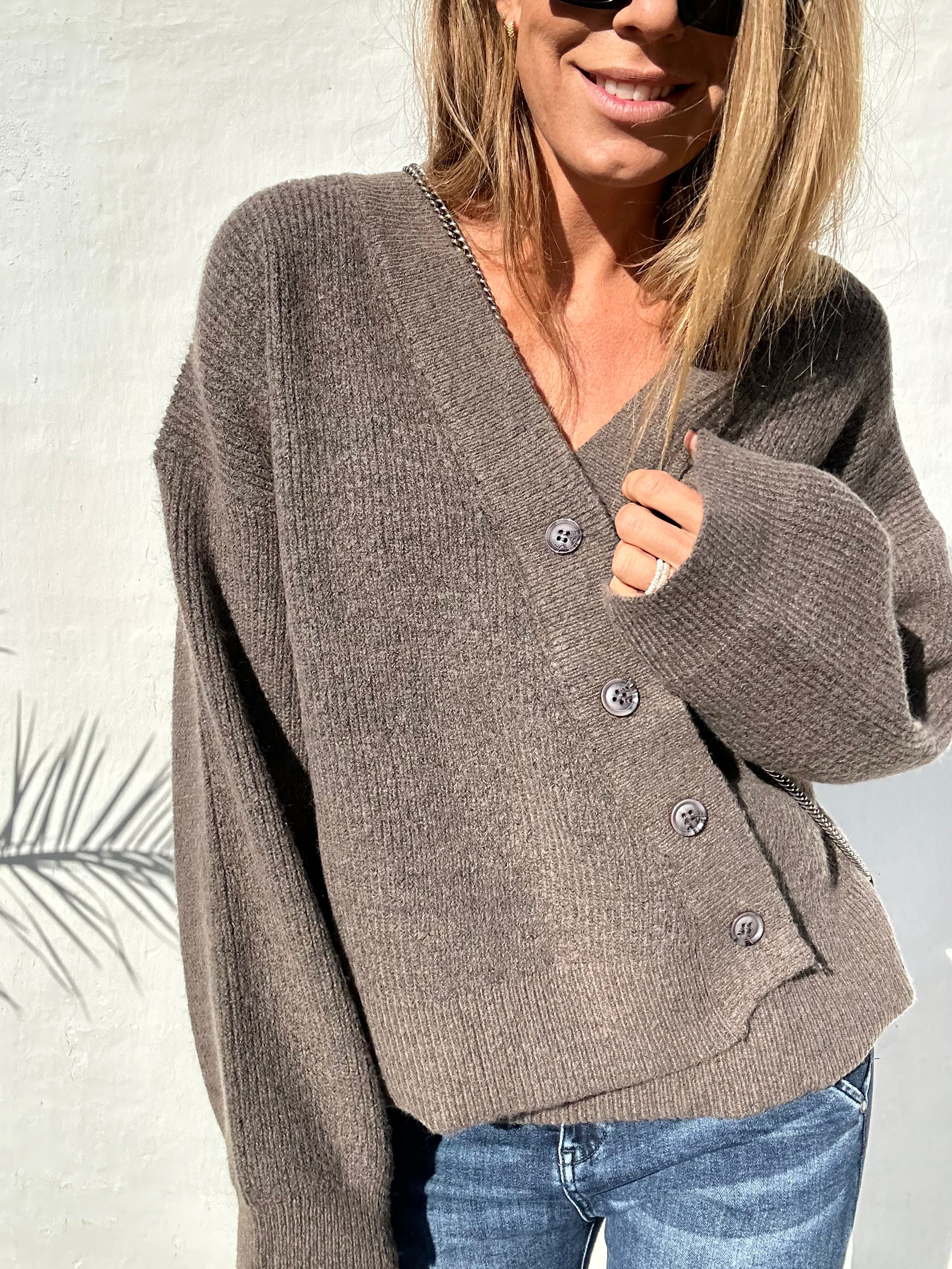 This Margot knitted cardigan is a chunky, soft knit with a loose fit and drop-shoulder sleeves. It has a deep V-neck with an asymmetrical three-button front closure. The color is a muted olive/brownish tone, and the material appears fluffy and textured. A loose-fitting model that is perfect for those chilly days with a pair of pants and warm boots .