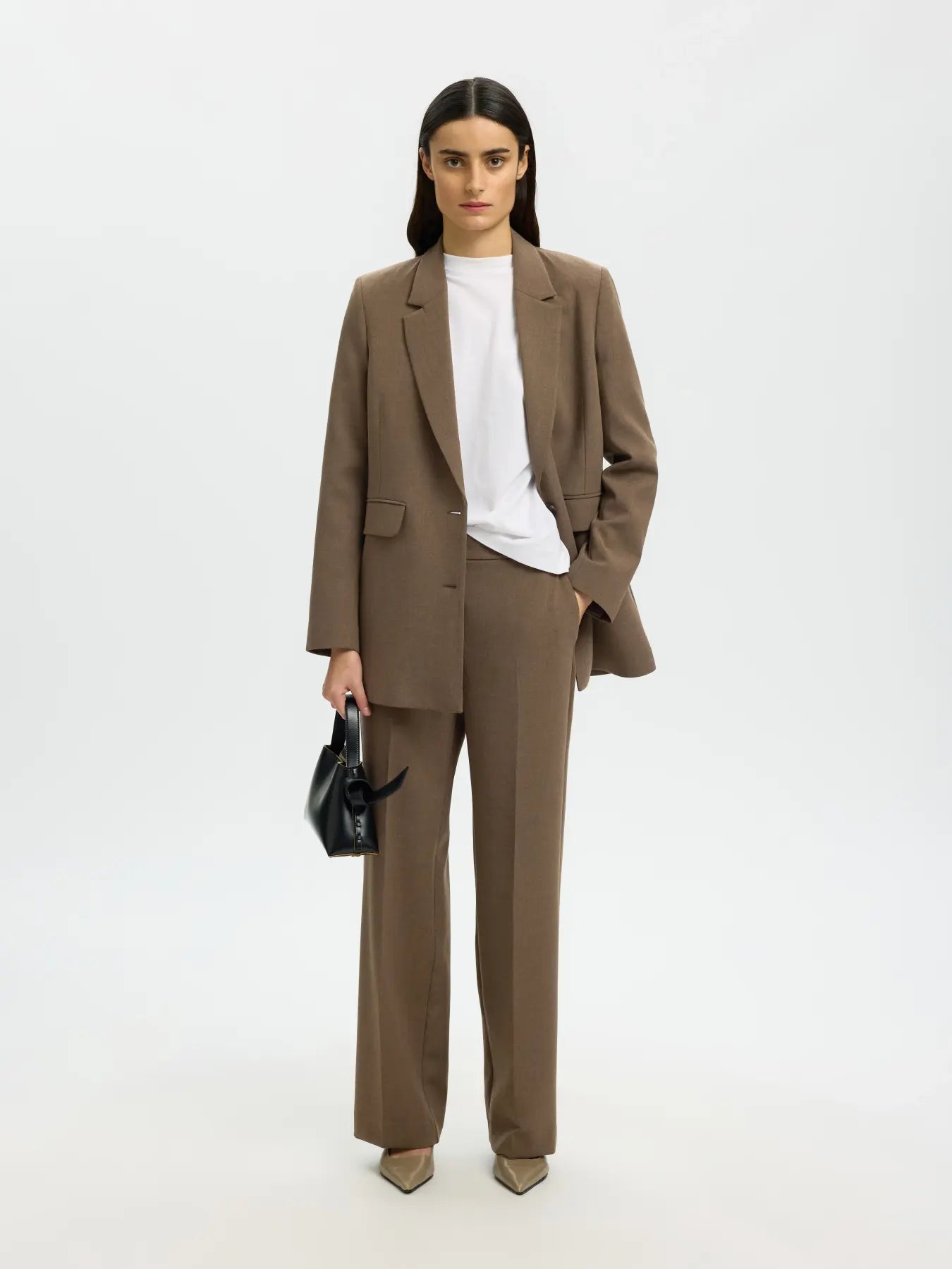 Bukser fra Selected Femme i farven Chocolate Chip (brun) har et tidløst og elegant udtryk med et moderne, afslappet snit. De er designet med lige ben og pressefolder, som giver et velklædt look, der fungerer både til hverdag og arbejde. Bukserne er en del af et matchende sæt og kan styles med den tilhørende blazer og en enkel top for et gennemført outfit.