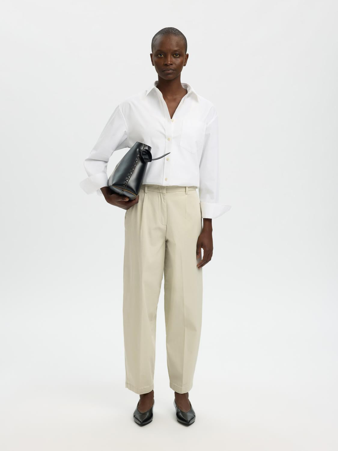 Disse bukser har en høj talje og en barrel fit, der giver et moderne og komfortabelt udtryk. Stoffet består primært af økologisk bomuld, hvilket gør bukserne både bløde og bæredygtige. Det elastiske materiale sikrer samtidig bevægelsesfrihed og pasform. Bukserne her fra Selected har side- og baglommer, hvor baglommerne er ikke-funktionelle, hvilket giver et stilrent look.
