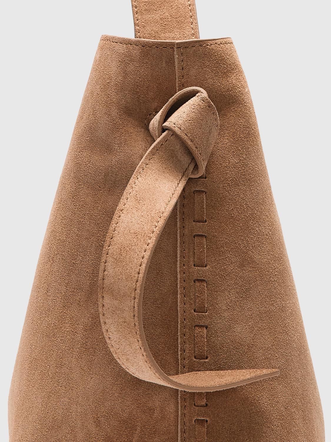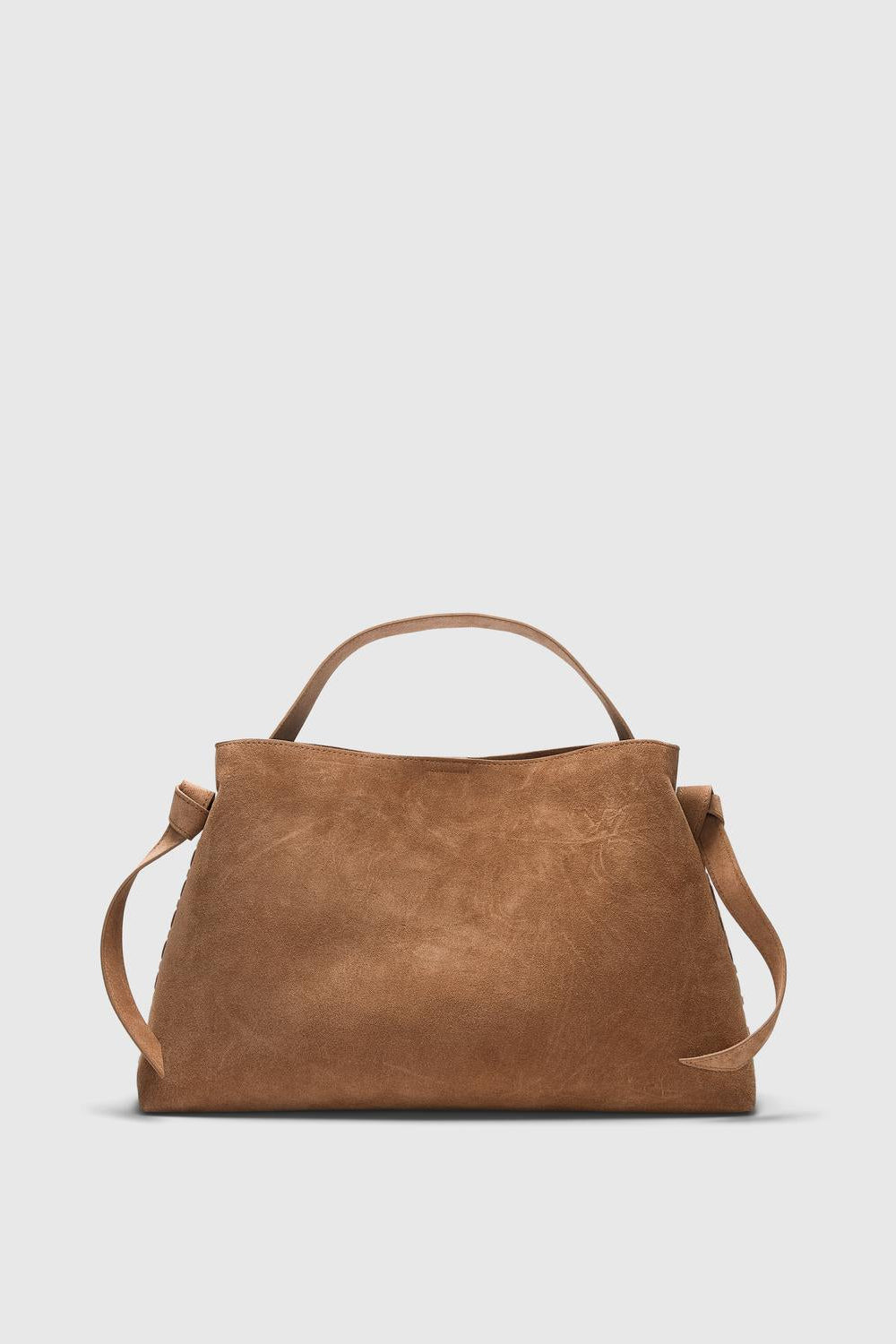 Tasken i medium størrelse er fremstillet i blødt kalvesuede med en flot knudedetalje, der giver den et unikt og elegant look. Den har en justerbar skulderrem for fleksibel bæring og en magnetisk lukning, der sikrer let adgang samtidig med, at indholdet holdes sikkert. Indvendigt finder du en lynlåslomme, der hjælper med at organisere mindre genstande. Taskens farve i en varm tan nuance giver et naturligt og alsidigt udtryk, der passer til mange outfits.