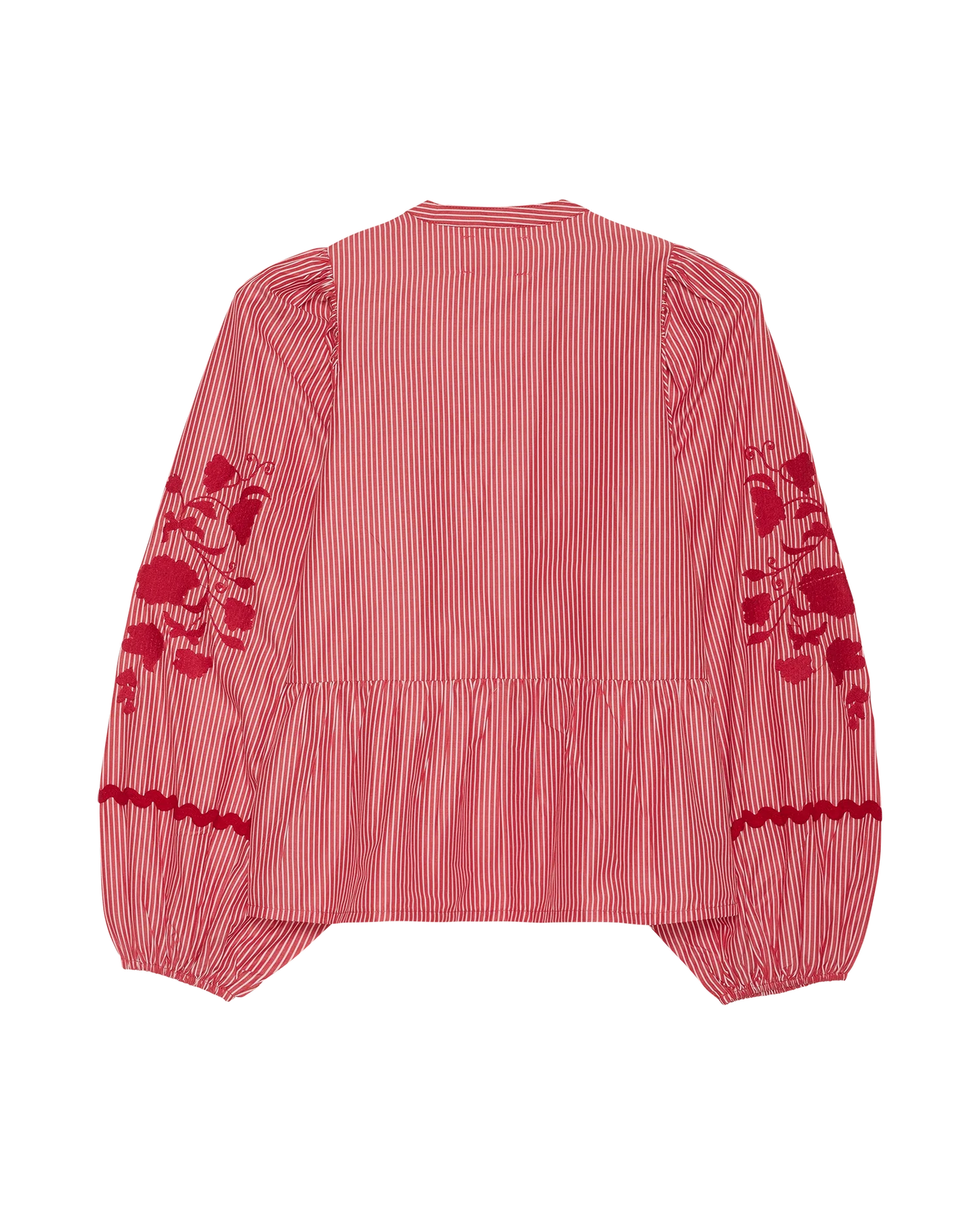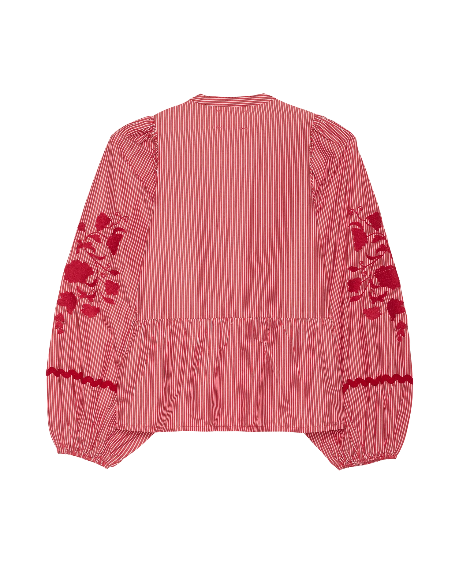 Blusen har voluminøse ballonærmer, der er rynket og afsluttet med elastik ved ærmeåbningen. Den er desuden pyntet med zig-zag bånd og delikat blomsterbroderi placeret smukt langs fronten og på ærmerne.