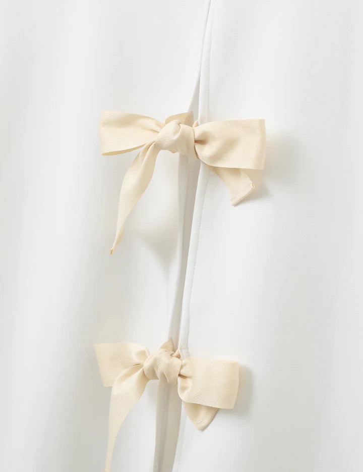 T-shirten er designet med openback og fine bow detailing i ryggen, hvor to sløjfer lukker den åbne ryg og skaber en elegant kontrast til den ellers enkle front. Den tunge bomuldskvalitet giver struktur og et eksklusivt fald, så silhuetten står skarpt.