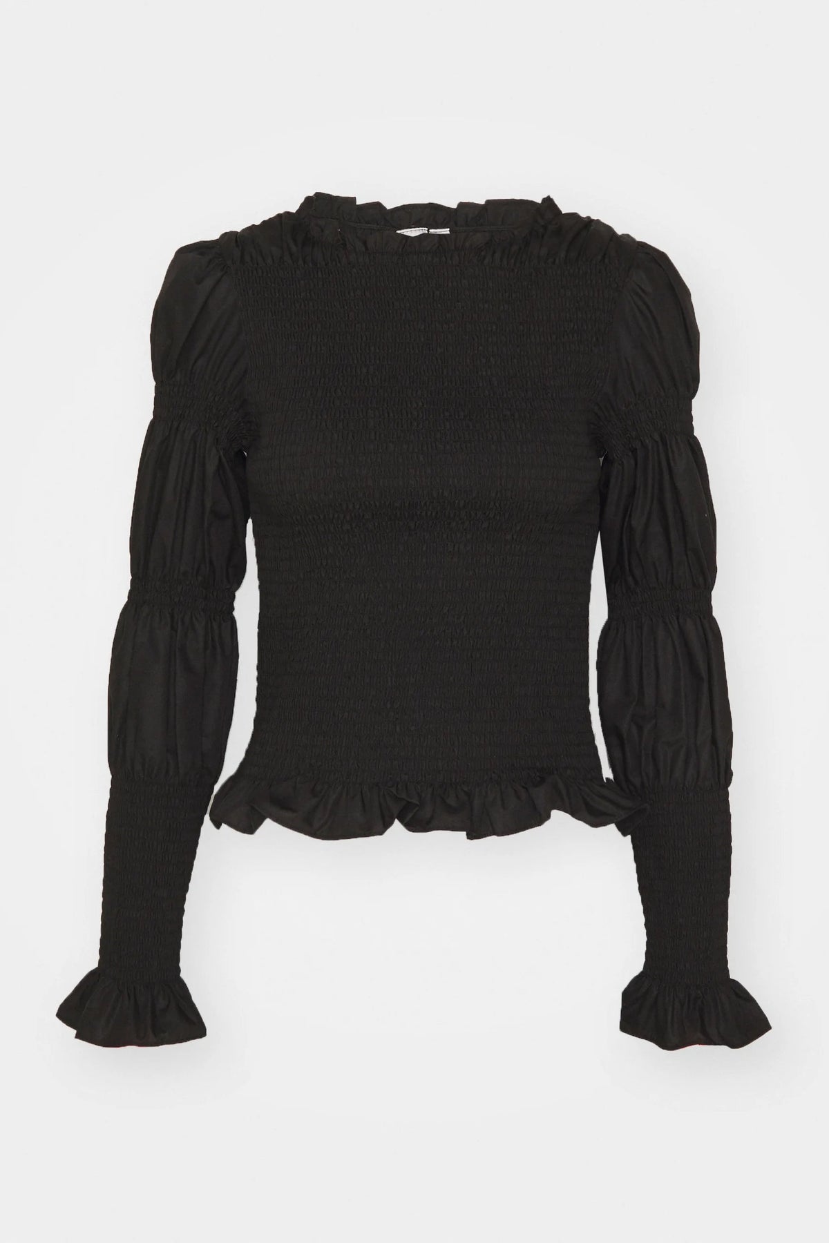 Halsudskæringen er rund med let flæsekant, og kanten forneden er let bølget for et blødt, feminint udtryk. En alsidig top, der fungerer både til hverdag med jeans og til mere festlige anledninger stylet med nederdel eller bukser.
